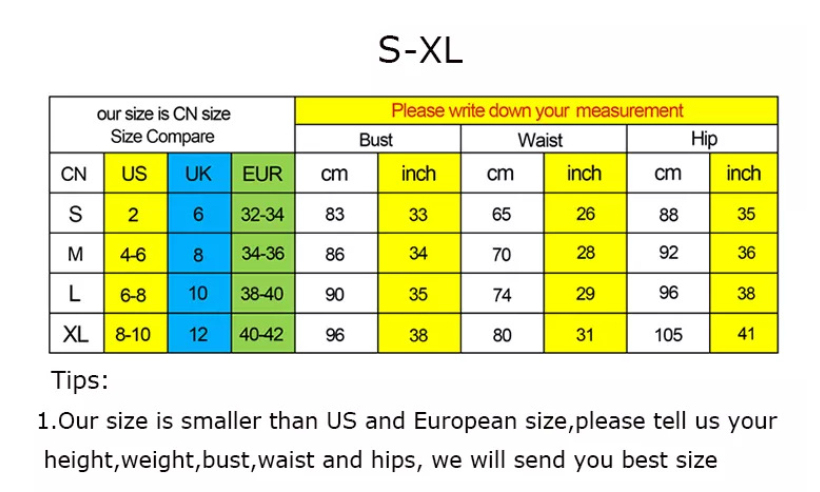 Note: 1. Asian sizes are 1 to 2 sizes smaller than European and American people. Choose the larger size if your size between two sizes. Please allow 2-3cm differences due to manual measurement. 2. Please check the size chart carefully before you buy the item, if you don't know how to choose size, please contact our customer service. 3.As you know, the different computers display colors differently, the color of the actual item may vary slightly from the following images.